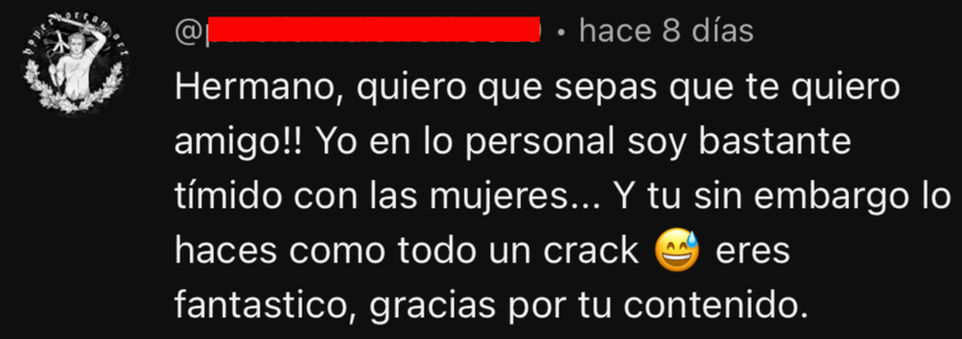 "Me encantó el Manual, lo leí en 3 tardes. Yassine me ha sorprendido acostumbrado a verlo en su programa como un gorila de espalda plateada. Creía que no tenía corazón (jajaja es broma) mis dieses. Lo que más me ha sorprendido, son las historias que usa de ejemplo y anécdotas muy pragmáticas. Y crudas. No me he sentido muy identificado con el hombre blandengue (que expone) como decia el Fary y él jajaja, creo que eso es bueno. (Miren ese vídeo no tienen desperdicio) Otra vez agradecer a este crack por el trabajo, se nota que lo hace como hobbie para ayudar a los hombres en esta Charocracia actual. Tengo pendiente escribirle un gmail por privado para comentar más cosas. Choque de 5 y a leerse el Manual!!"